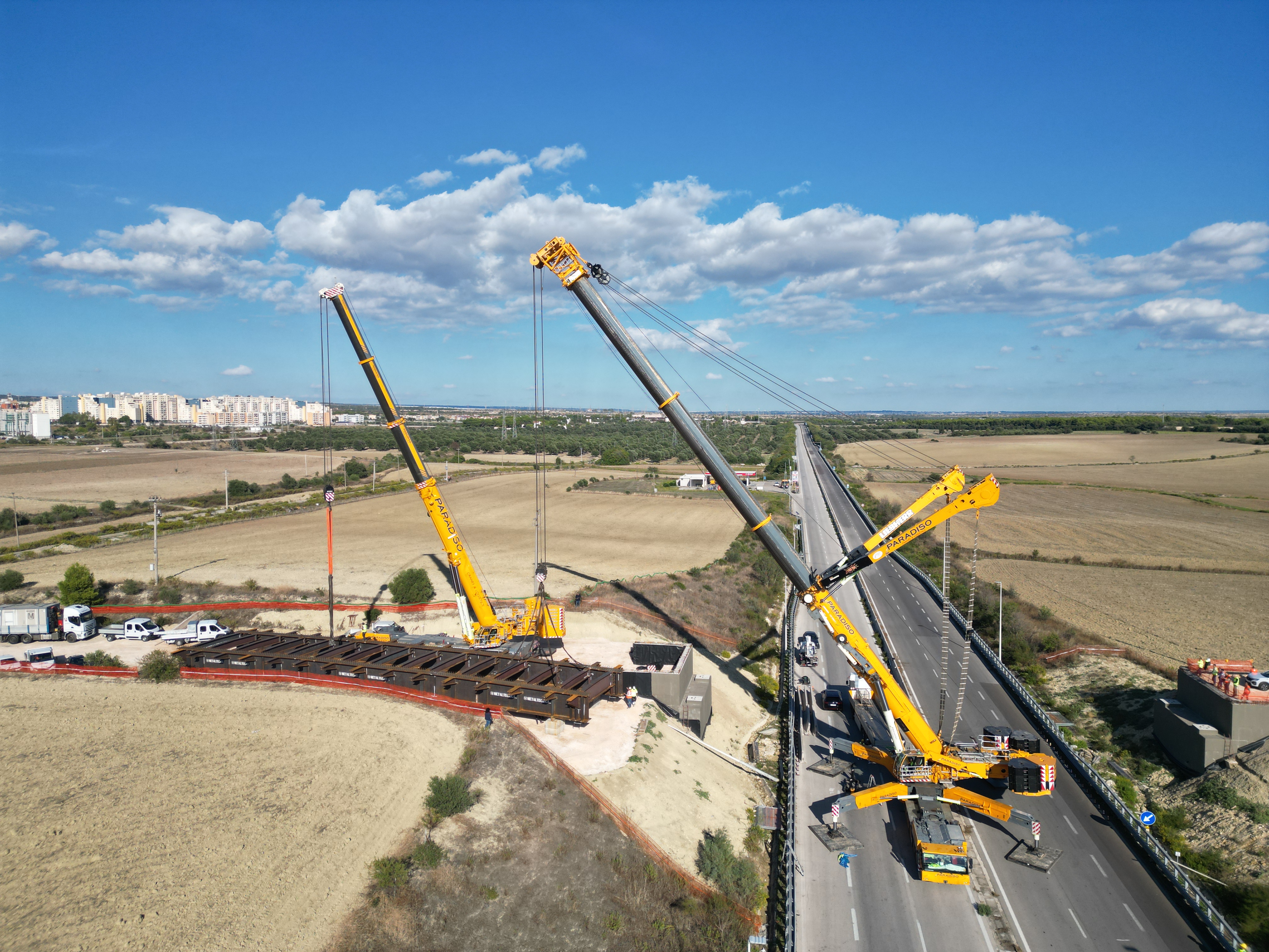 Nei giorni compresi tra il 9 ed il 13 ottobre scorso, si è provveduto alle attività attività di varo e a quelle complementari, della nuova struttura in acciaio “tipo corten” (S355J2W+N), dal peso di circa 170 tonnellate e costituita da due travi principali a doppio T, di altezza pari a 2 metri, collegate da quindici traversi, per una