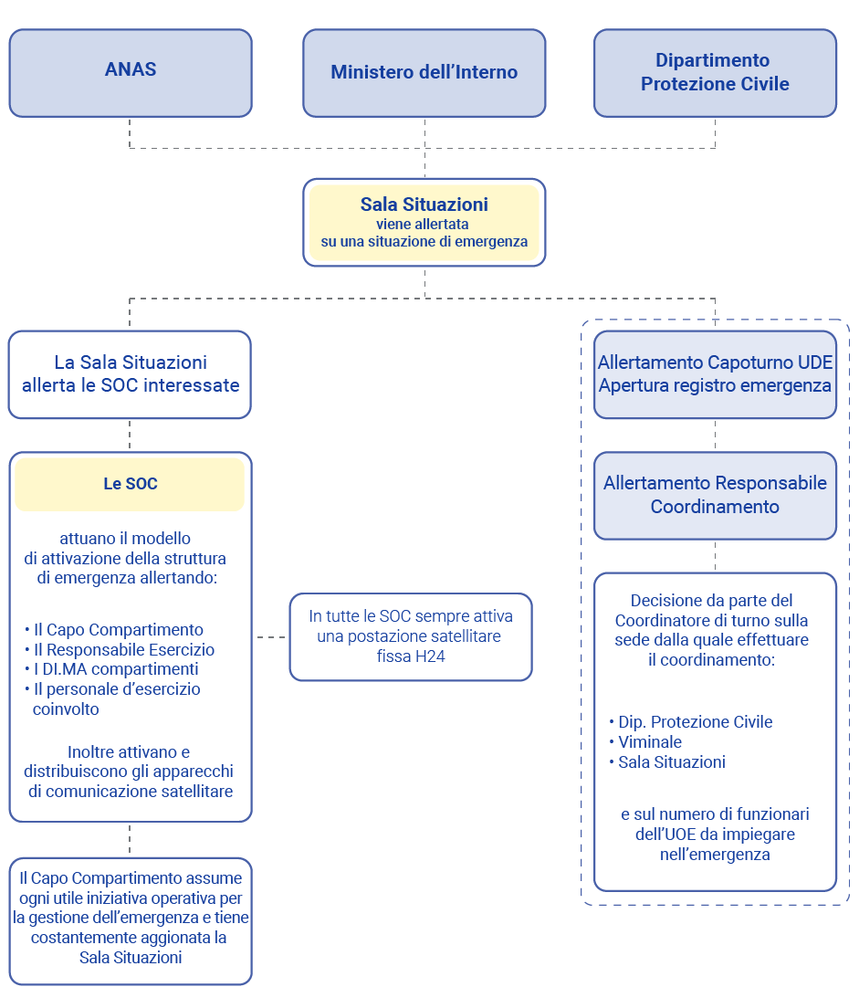 In caso di attivazione delle strutture di emergenza, il coordinatore si recherà presso la sala situazioni nazionale Anas per la necessaria uniformità di indicazioni da fornire per la gestione dell'emergenza stessa. Il personale dell'unità operativa di emergenza sarà presente presso le sedi istituzionali attivate con il compito di referente per conto del coordinatore dell'emergenza.