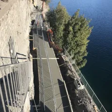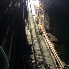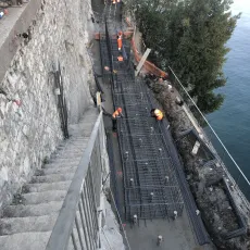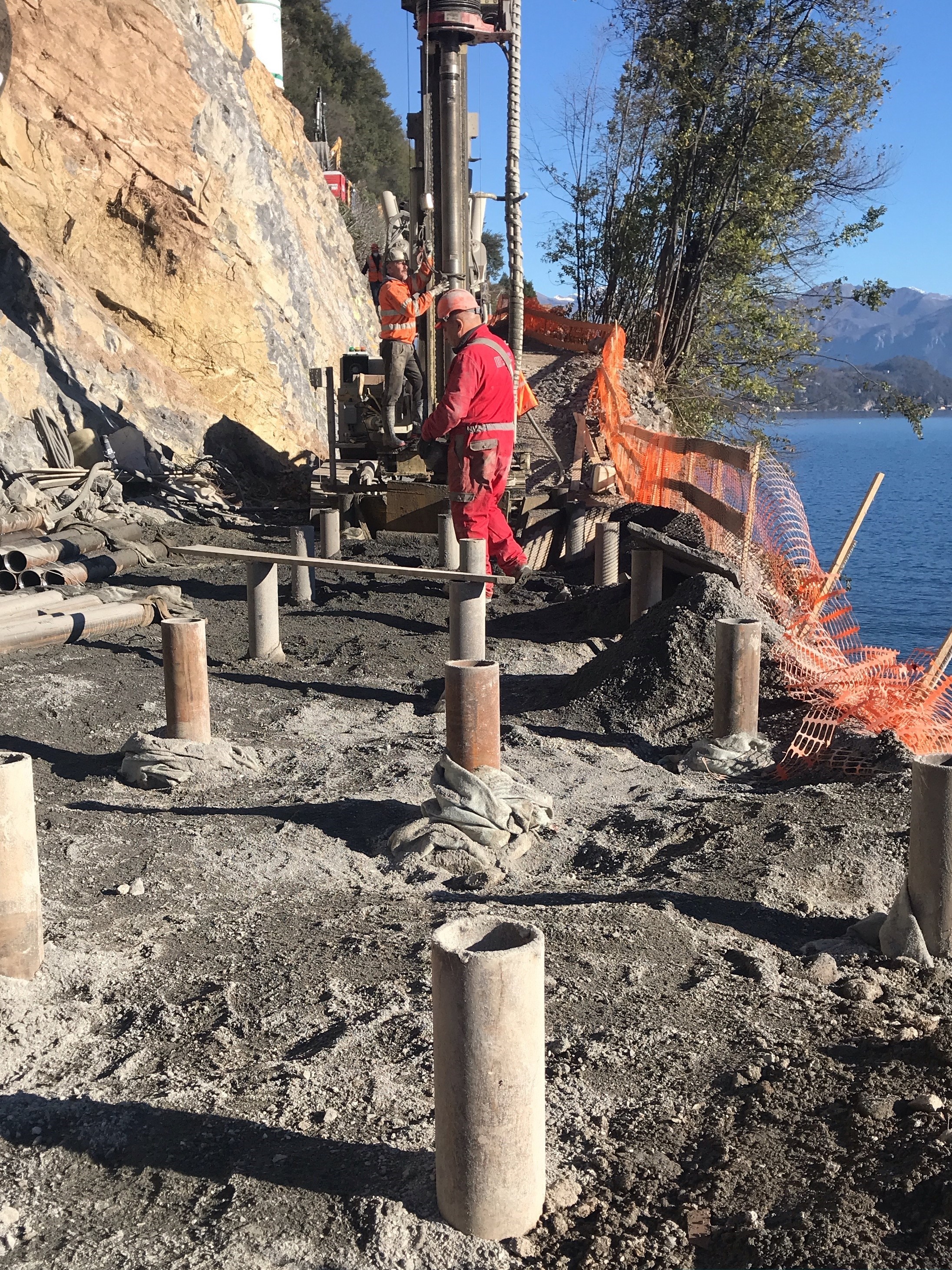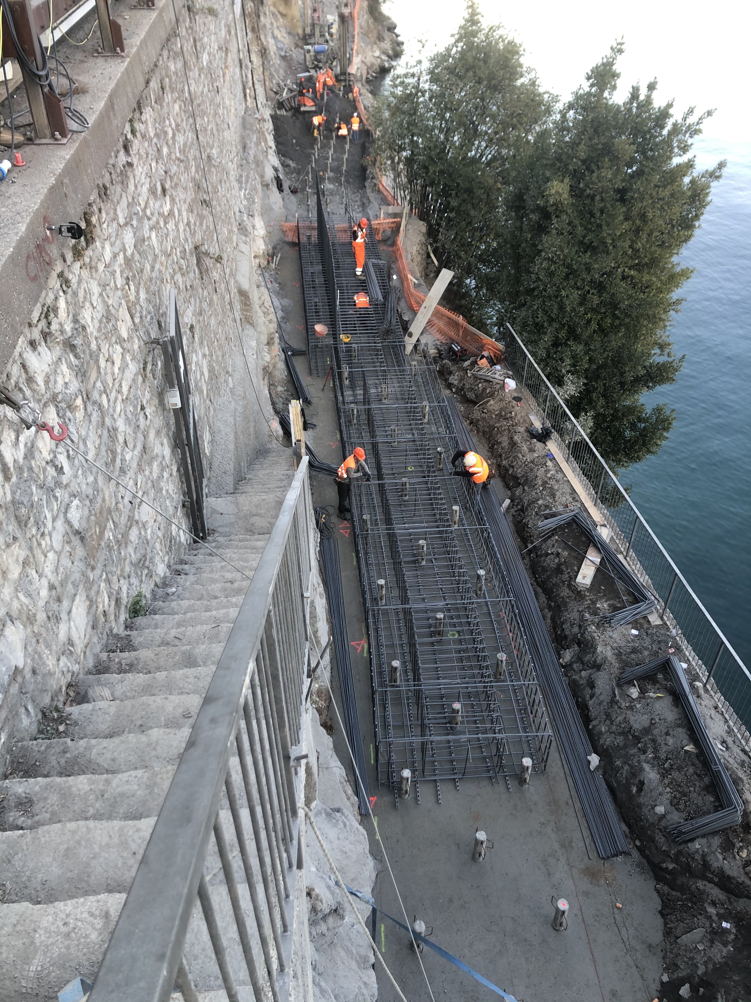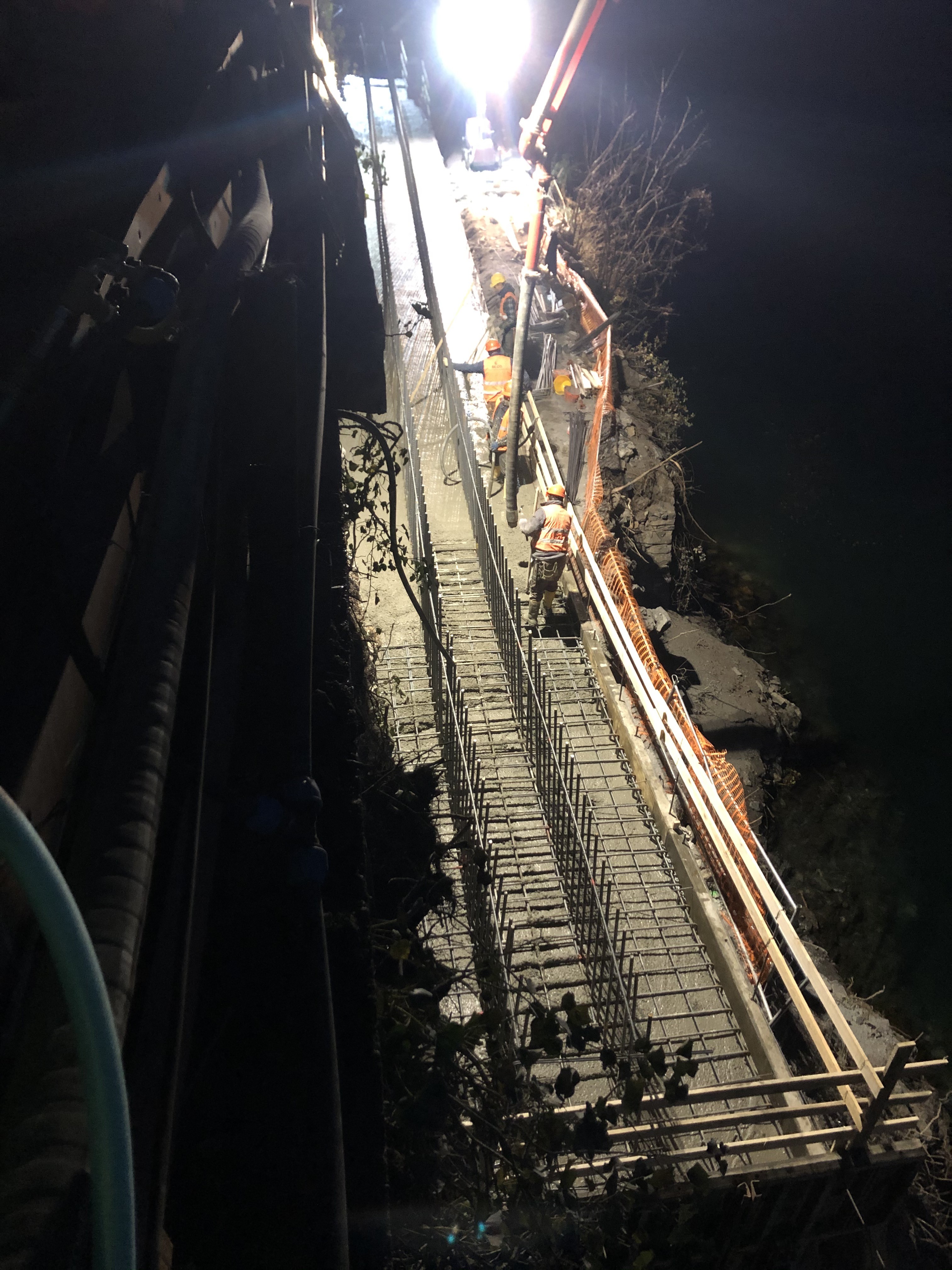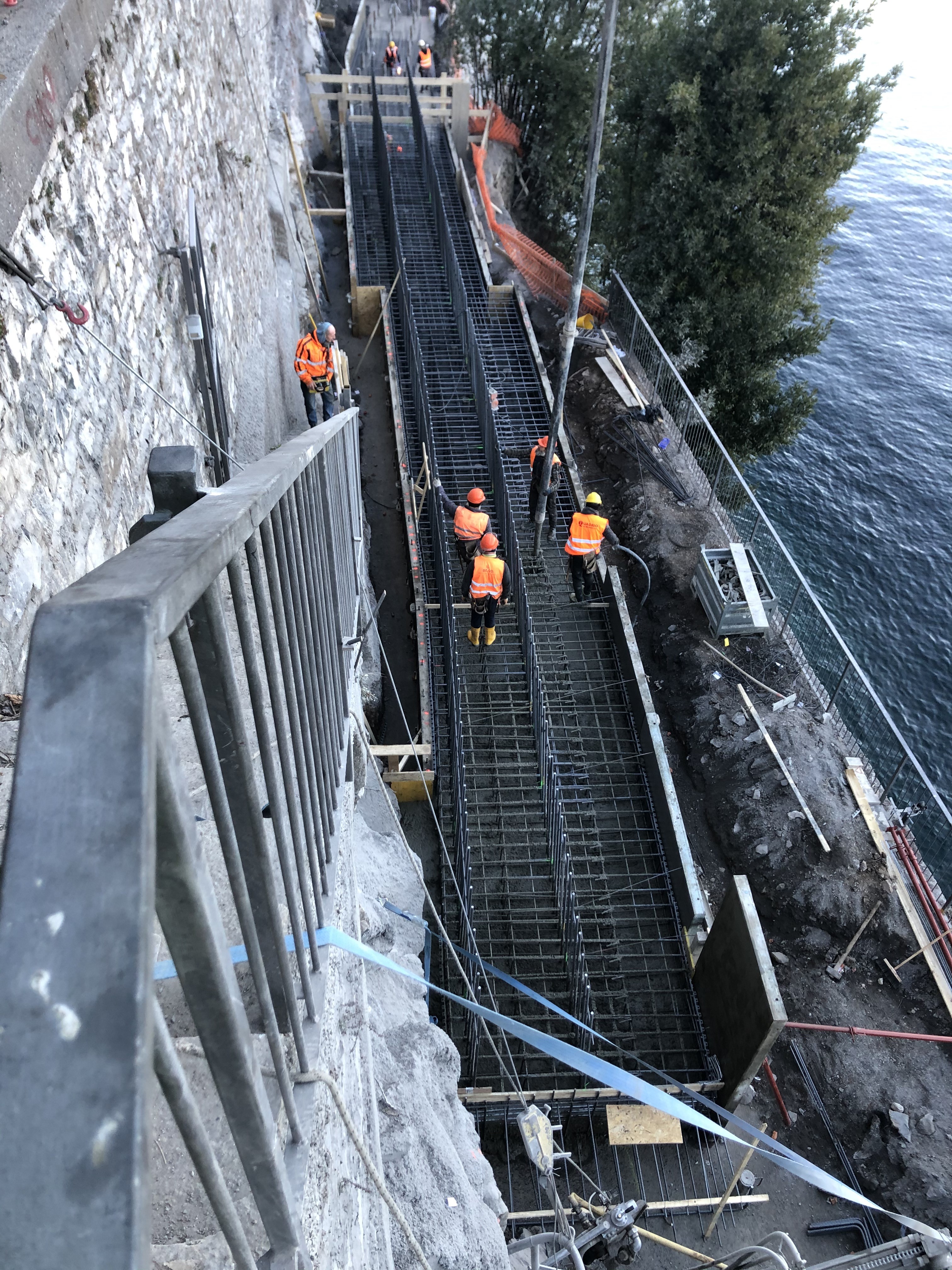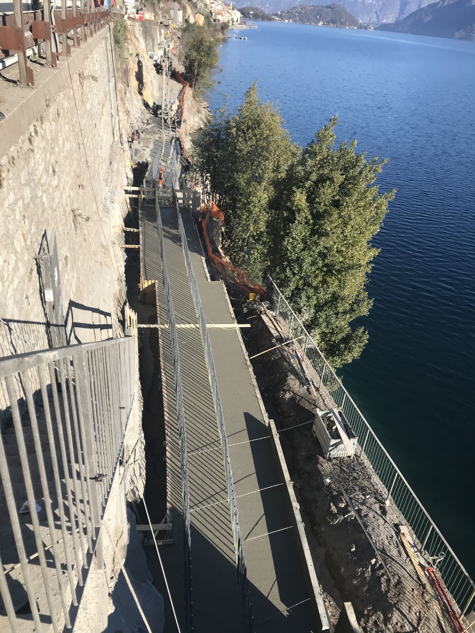 Nei giorni scorsi è stato completato il getto di 4 conci della fondazione del muro lato lago e proseguono le realizzazioni dei micropali, delle chiodature e la posa delle armature dei rimanenti conci.